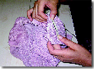 縫い上がった商品は一枚一枚手にとって厳しく検査します。